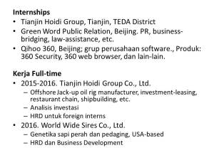 Pengalaman ku yang berhubungan dengan pekerjaan lainnya adalah tentu saja soal kerja penuh waktu (full-time). Tempat kerja ku pertama kali ada di Tianjin Hoidi Group, yang juga merupakan lokasi di mana aku menghabiskan waktu magang ku pertama kali. Ketika aku diterima untuk bekerja di Hoidi ini, aku senang bukan main. Karena suasana kota, kantor, dan pegawai-pegawai nya sudah tidak asing lagi untukku, jadi aku bisa mulai bekerja tanpa hambatan. Namun, tentu saja ada perbedaan dalam hal job desc yang aku harus tangani. Selain penerjemahan, aku diamanatkan untuk bisa melakukan beberapa hal lain. Karena perusahaan tersebut bentuknya adalah Group, jadi memang memiliki banyak lini aktivitas bisnis salah satunya investasi. Investasi ini memang yang paling membutuhkan SDM dari berbagai negara. Oleh karena itu, selain melakukan analisis bisnis untuk mencari peluang-peluang investasi, aku juga berkesempatan untuk menjadi perekrut rekan-rekan mahasiswa asing untuk magang di perusahaan Hoidi tersebut. Antara lain aku sempat merekrut rekan-rekan dari Guniea Bissau, Peru, Rusia, Austria, dan Norwegia. Perusahaan memang bergerak di bidang manufaktur rig pengeboran lepas pantai. Hal ini memiliki konsekuensi ketergantungan terhadap harga minyak. Oleh karena itu, ketika harga minyak mulai jatuh sejak tahun 2015 akhir, performa perusahaan pun juga menurun. Oleh karena itu aku memutuskan untuk keluar dari Hoidi dan mencari pekerjaan lain di Beijing.
